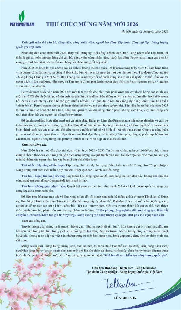 Thư chúc mừng năm mới 2026 của Chủ tịch Hội đồng Thành viên, Tổng Giám đốc Tập đoàn Công nghiệp – Năng lượng Quốc gia Việt Nam